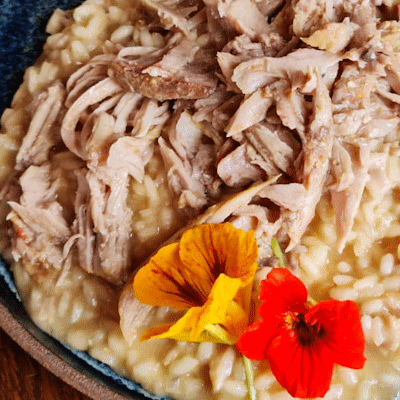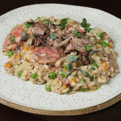 Pato Confit Desfiado, Arroz Arbóreo, Cebola, Cenoura, Ervilha, Linguiça e Pastrami Defumado. R$147