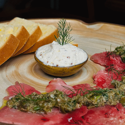Truta curada (método gravlax), com aioli de limão e mostarda ancienne e um toque de alcaparra. Delicada e leve. Acompanha pão artesanal. R$67