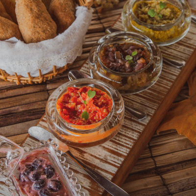 Pães Artesanais servidos com três Antepastos Azeitados, Caponatas, Tapenades e Manteiga de Castanhas. Serve duas pessoas. R$63