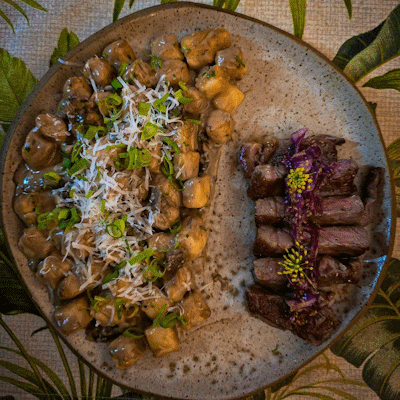 Delicado Nhoque de Abóbora com Tiras de Mignon no Molho Bechamel com Gorgonzola, finalizado com Ervas Frescas da Nossa Horta. R$101