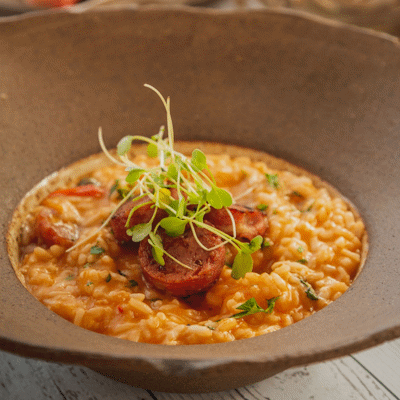 Risoto com Linguiça de Cogumelos Artesanal, Azeitonas Pretas, Tomates Assados, Alcaparras, Cebolas e Manjericão. Finalizado com Parmesão de Leite de Castanhas. R$98