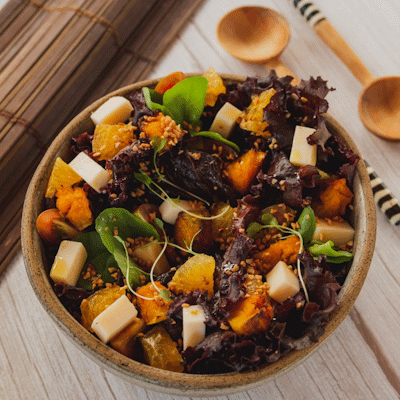 Mix de Folhas da Horta, Tomate Sweet, Abóbora Assada, Laranja, Mozzarela de Castanhas e Molho Especial. Individual. R$58